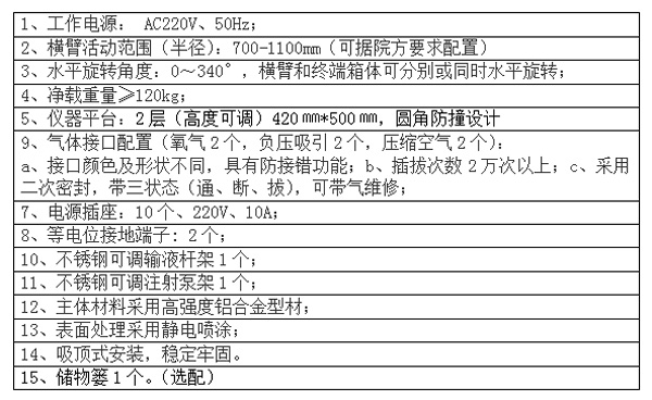 隨著微創(chuàng)技術(shù)的發(fā)展,腔鏡技術(shù)已普遍應(yīng)用到普外科、泌尿科、婦科、胸外科等手術(shù)領(lǐng)域。腔鏡塔作為腔鏡設(shè)備的承載平臺,為手術(shù)工作提供服務(wù)。腔鏡塔采用天花懸掛方式,高承載能力,塔體和橫臂能旋轉(zhuǎn)340度,并配置制動剎車防漂移,塔體配有多層設(shè)備平臺以及醫(yī)用氣體、電源、網(wǎng)絡(luò)輸出終端等;操作簡單,使用方便。